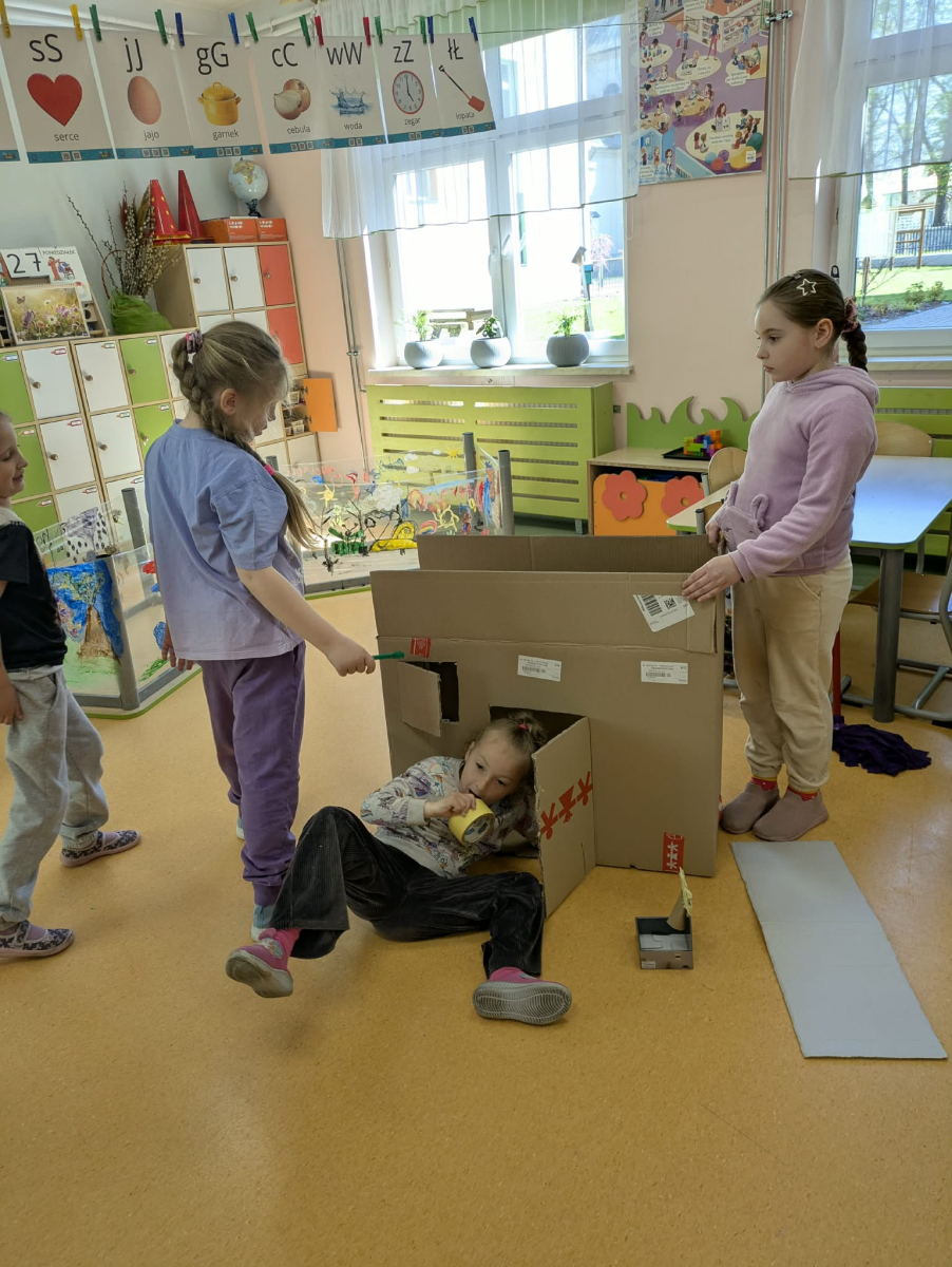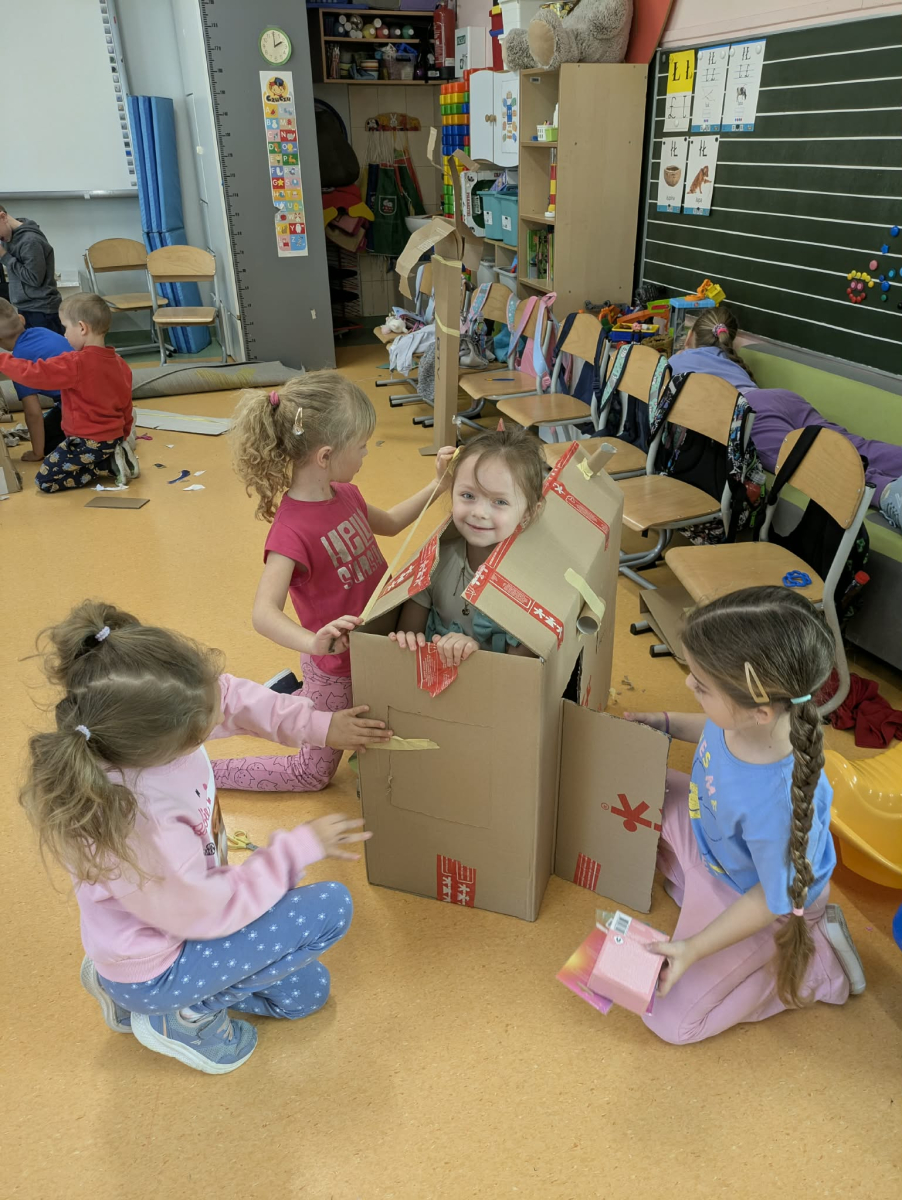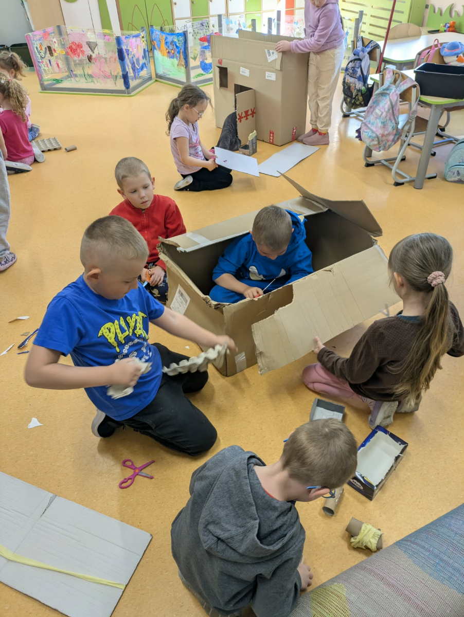 W oddziale przedszkolnym odbył się wyjątkowy „Dzień bez zabawek”. Tego dnia dzieci rozwijały swoją wyobraźnię i kreatywność, korzystając z prostych materiałów, takich jak kartonowe pudełka, taśma czy folia. Przedszkolaki z zaangażowaniem tworzyły własne konstrukcje i wymyślały nowe formy zabawy. Dużo radości sprawiło im również malowanie na folii, które stało się okazją do twórczej ekspresji oraz eksperymentowania z kolorami. Był to dzień pełen pomysłowości, współpracy i dobrej zabawy.