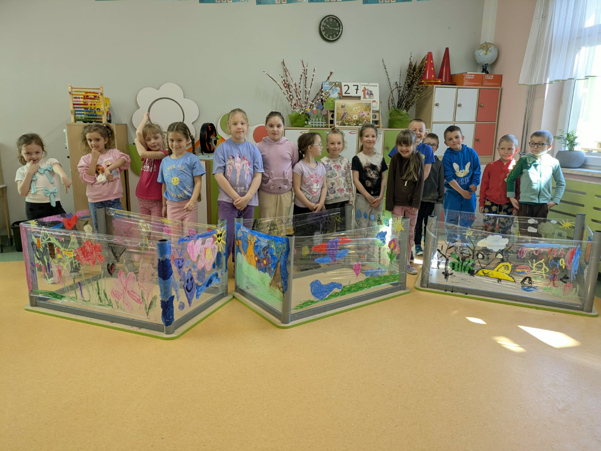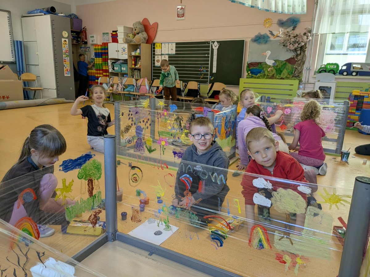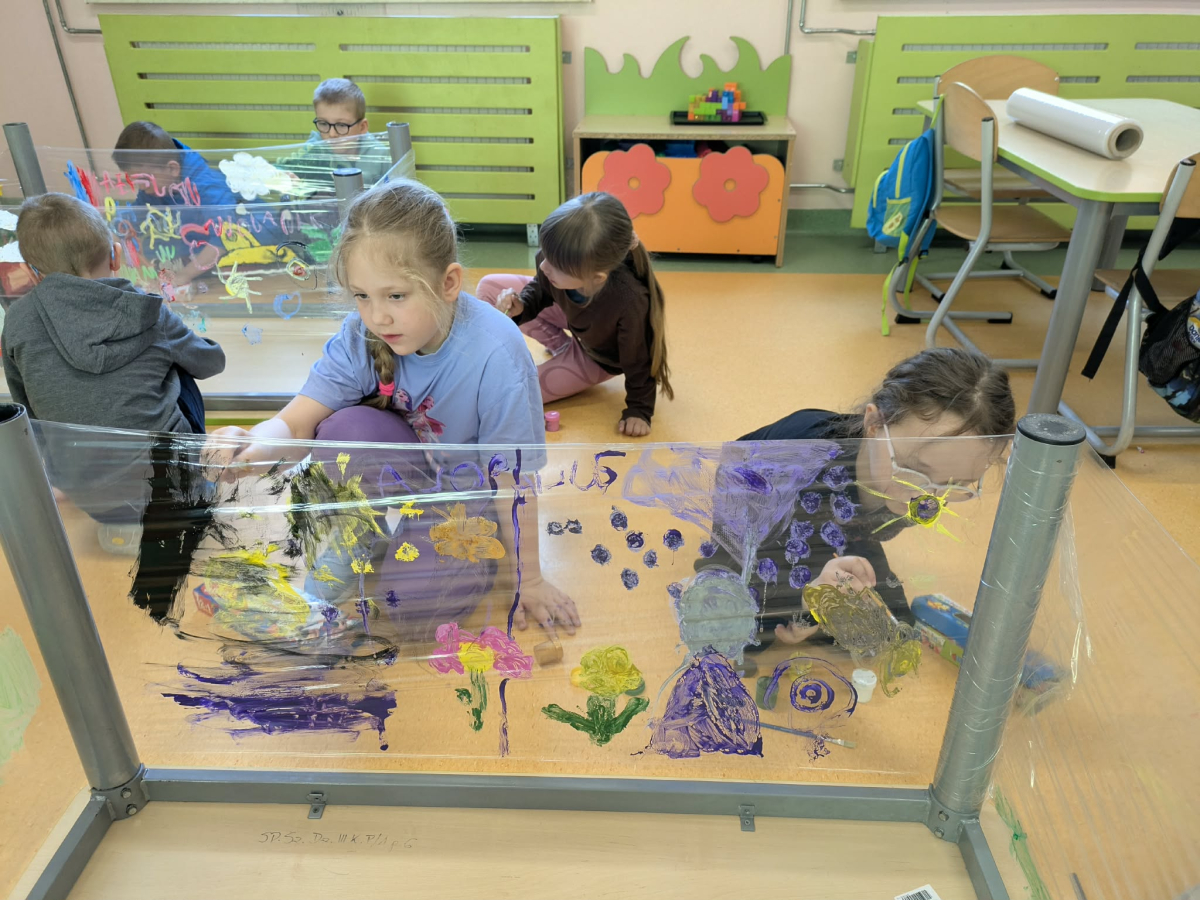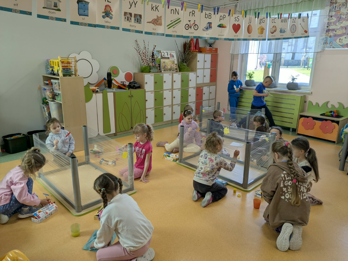 W oddziale przedszkolnym odbył się wyjątkowy „Dzień bez zabawek”. Tego dnia dzieci rozwijały swoją wyobraźnię i kreatywność, korzystając z prostych materiałów, takich jak kartonowe pudełka, taśma czy folia. Przedszkolaki z zaangażowaniem tworzyły własne konstrukcje i wymyślały nowe formy zabawy. Dużo radości sprawiło im również malowanie na folii, które stało się okazją do twórczej ekspresji oraz eksperymentowania z kolorami. Był to dzień pełen pomysłowości, współpracy i dobrej zabawy.