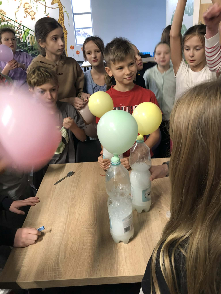 Dzieci uczestniczyły w ciekawych warsztatach chemicznych, podczas których dowiedziały się, jak soda reaguje z octem. Efektem doświadczenia było nadmuchanie balonu, co wzbudziło duże zainteresowanie i radość wśród uczniów.