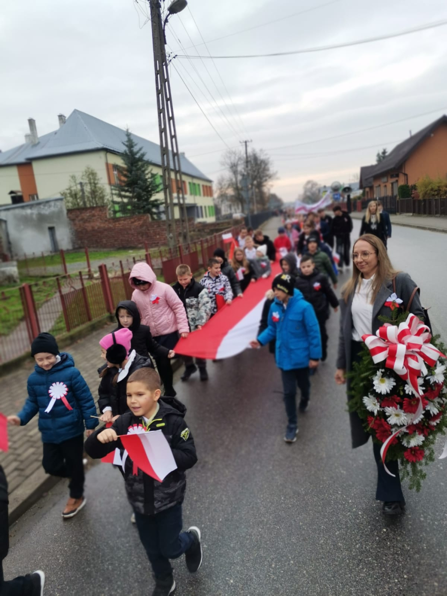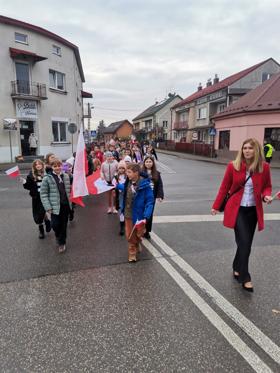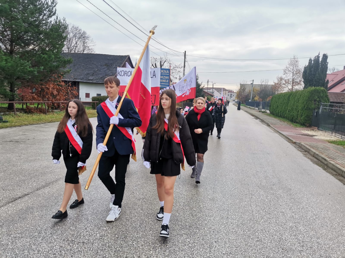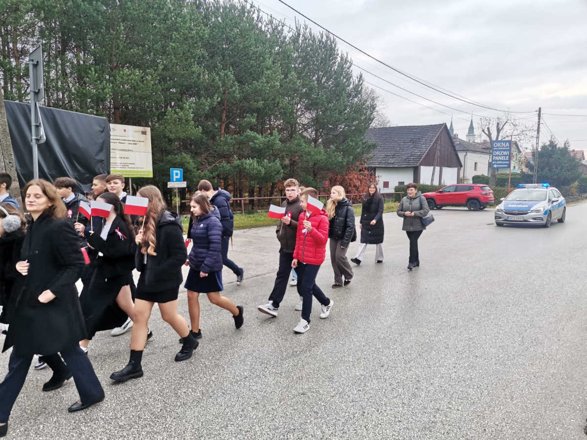 W biało- czerwonym korowodzie, przy dźwiękach pieśni patriotycznych, uczniowie powrócili bezpiecznie w mury szkoły, pod czujnym okiem funkcjonariuszy policji z posterunku w Szczurowej.