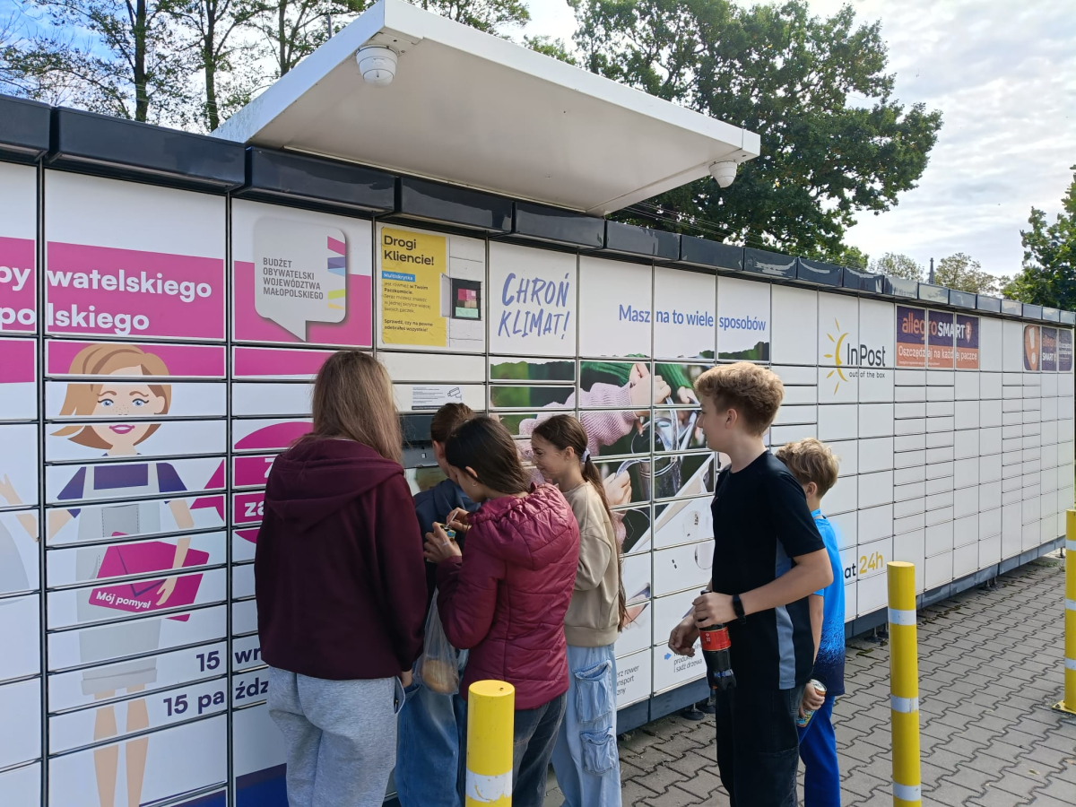 Zatrzymaliśmy się również przy paczkomacie InPost, gdzie uczniowie zauważyli, że cała obsługa przesyłek możliwa jest dzięki komputerowi.
