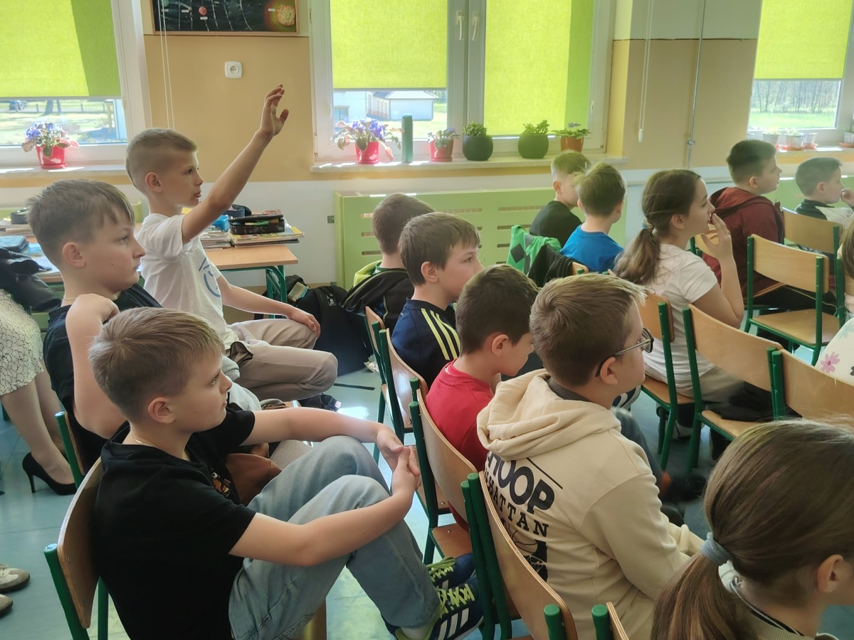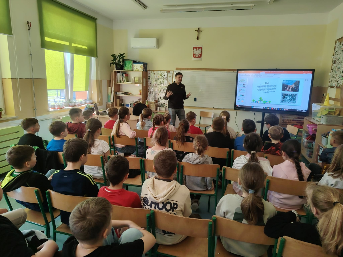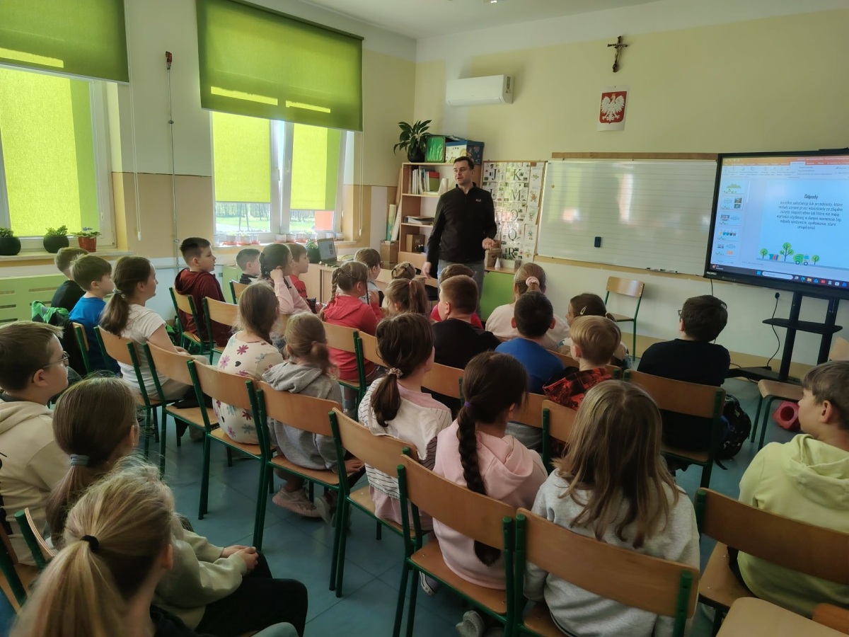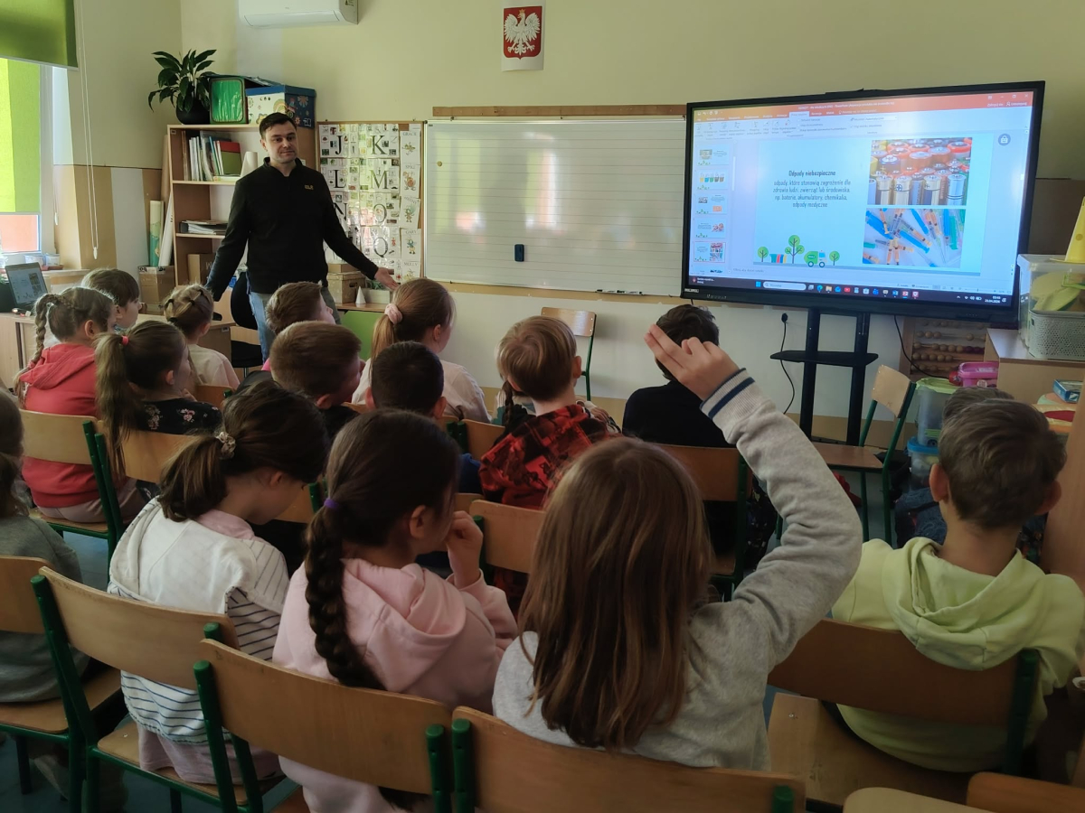 W dniu 23.04.2026 r. uczniowie klas trzecich uczestniczyli w spotkaniu z ekologiem, podczas którego poruszono ważne zagadnienia związane z ochroną środowiska. W trakcie prelekcji uczniowie dowiedzieli się, jak prawidłowo segregować odpady, gdzie można je oddawać oraz które odpady nie nadają się do recyklingu.
