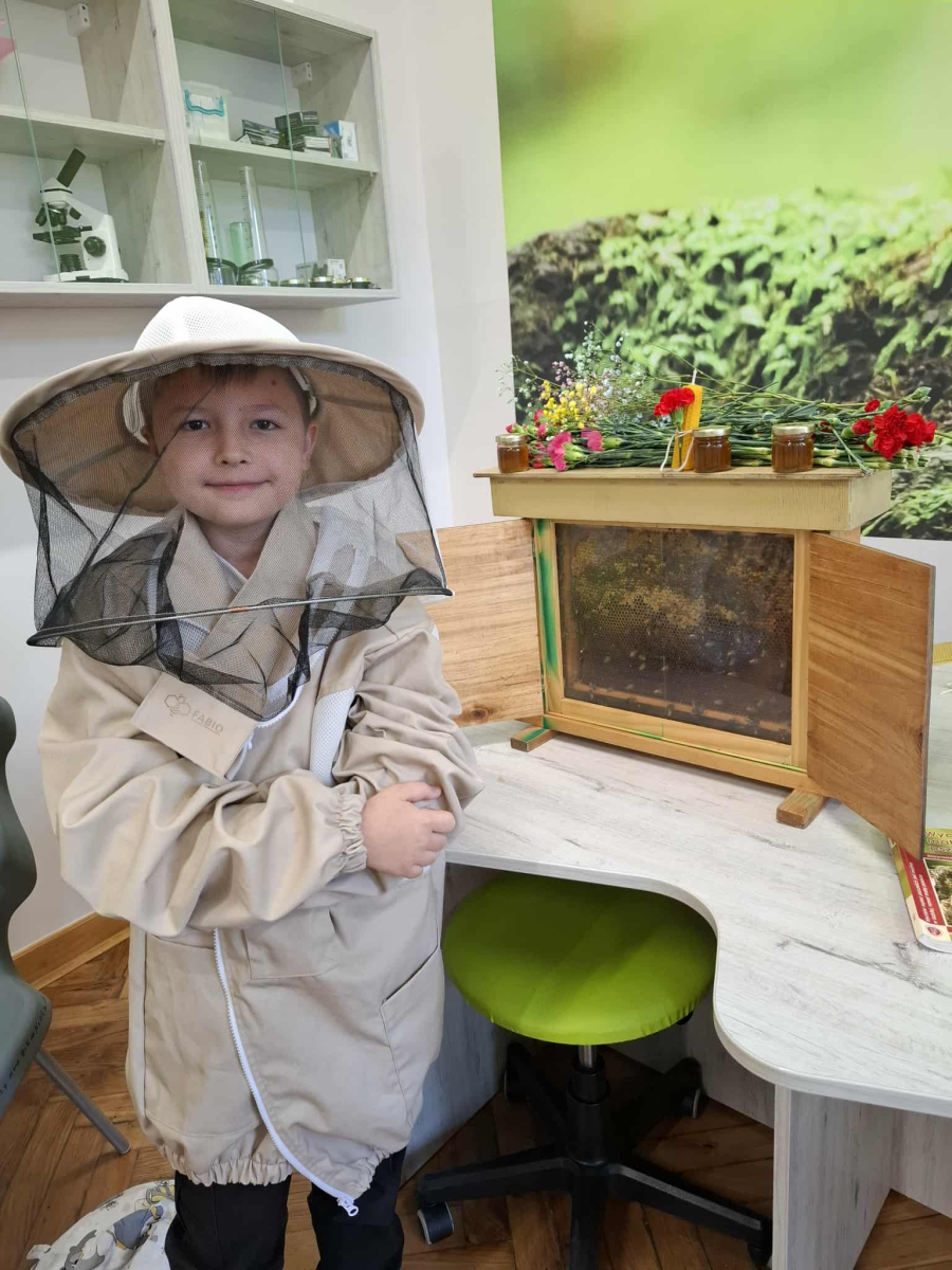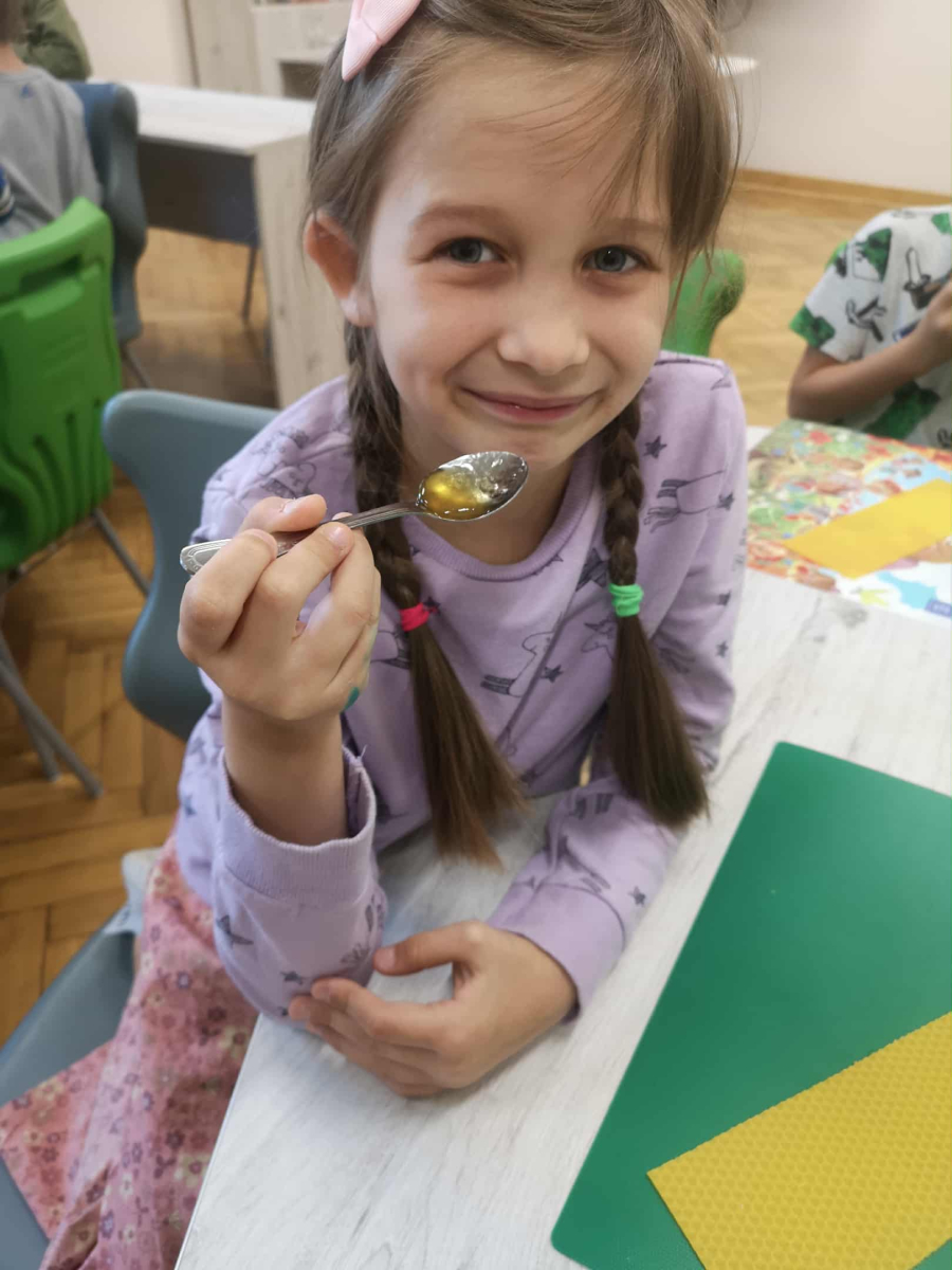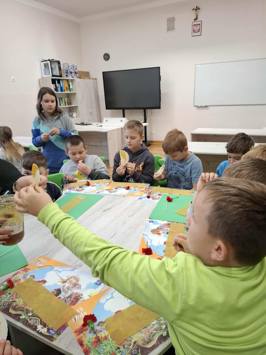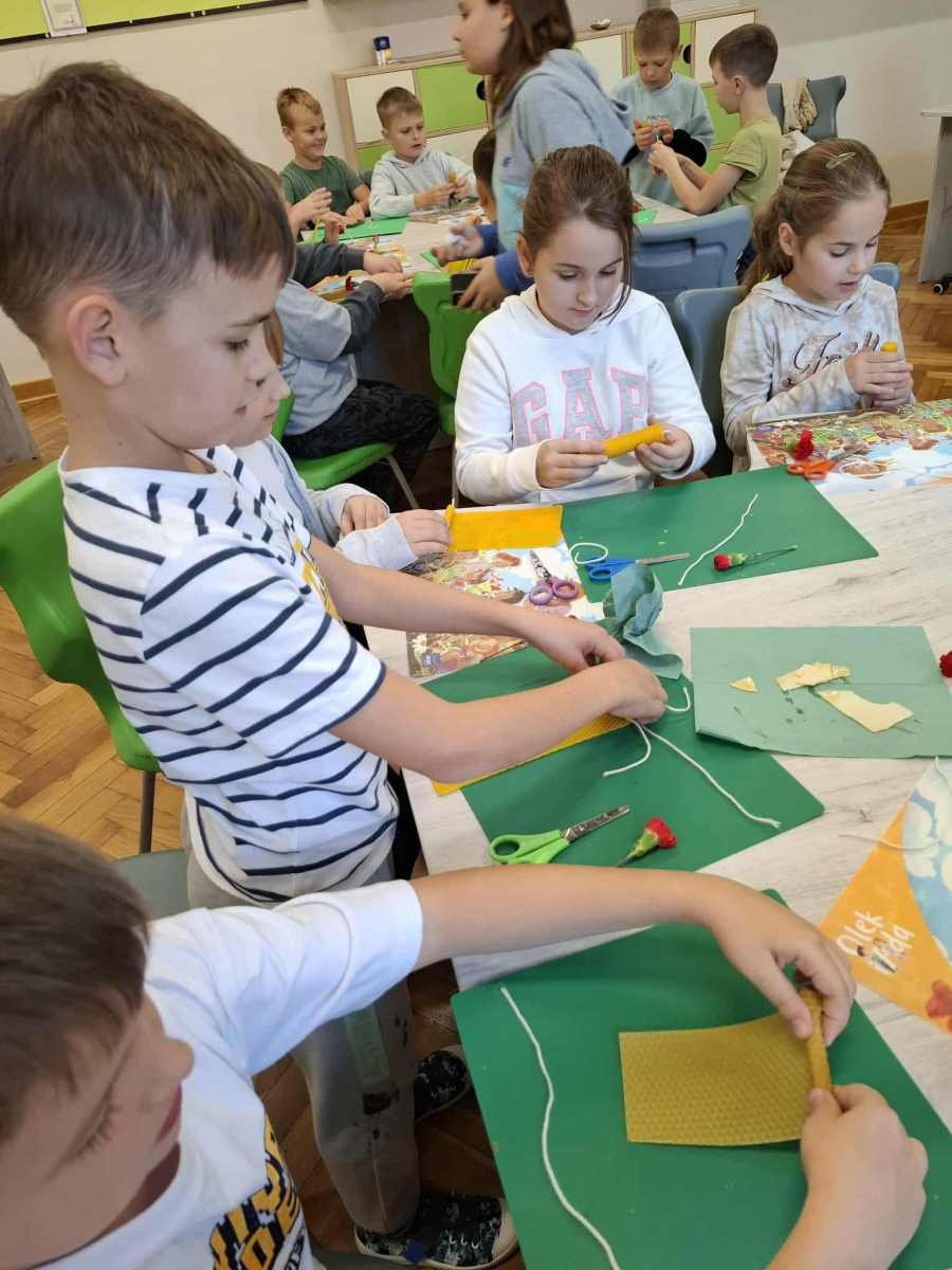 Dużą atrakcją było oglądanie i przymierzanie stroju pszczelarskiego oraz żywych pszczół. Uczniowie mogli również spróbować prawdziwego miodu prosto z pasieki. Na zakończenie spotkania każdy uczestnik wziął udział w warsztatach i wykonał własną świecę z wosku pszczelego.