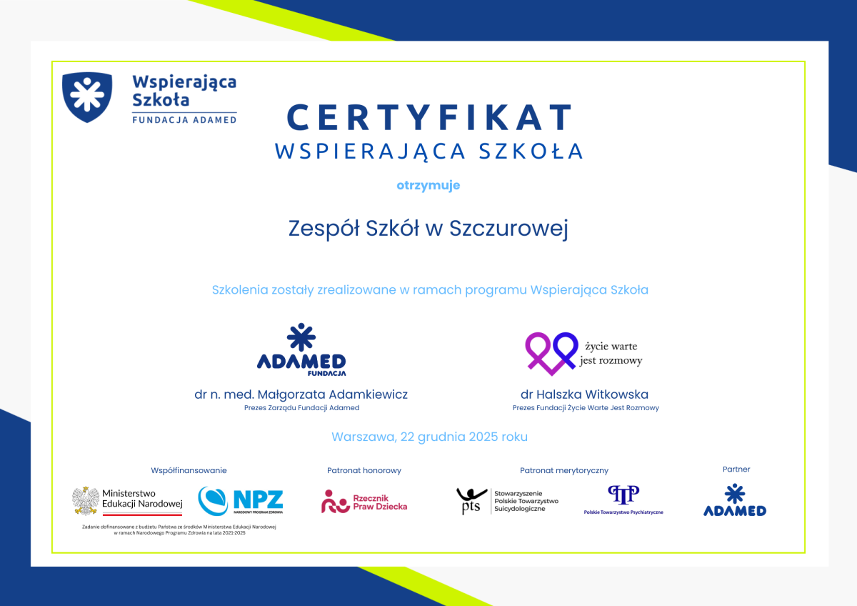 Zespół Szkół w Szczurowej znalazł się w gronie zaledwie 55 szkół w Polsce, które otrzymały ten prestiżowy certyfikat, co czyni to wyróżnienie jeszcze bardziej wyjątkowym. Podczas gali certyfikaty wręczały m.in. Wiceminister Edukacji Paulina Piechna-Więckiewicz oraz dr Halszka Witkowska. Wydarzenie zostało zorganizowane pod patronatem m.in.: MEN, Fundacji Adamed, Fundacji Życie Warte Jest Rozmowy oraz Polskiego Towarzystwa Suicydologicznego.